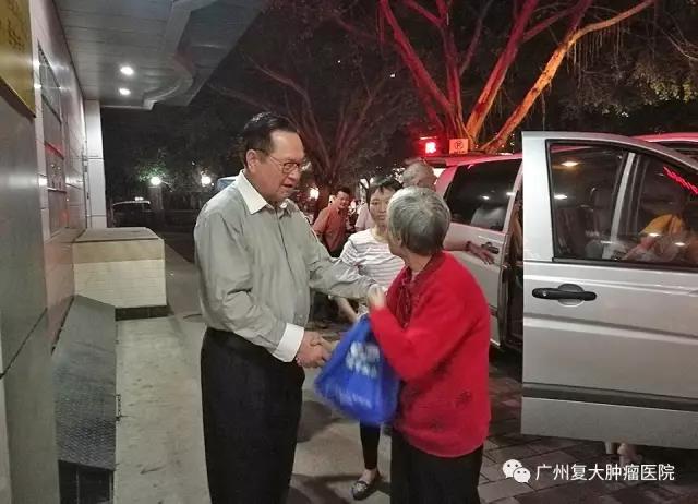 ↑ 晚上7点30分,经过四个多小时的车程,满载患者和家属的中巴车到达广州复大肿瘤医院海珠院区。徐克成总院长与一众医护人员早已在医院等候患者家属。