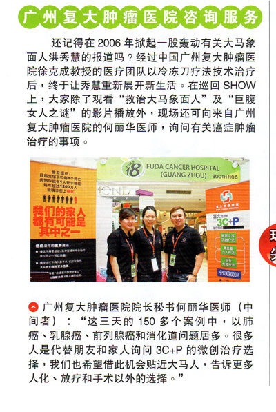 马来西亚《大家健康》杂志NO.214刊载复大医院肿瘤咨询服务信息, 可以为咨询者详细介绍复大医院肿瘤最新疗法“3C+P”.