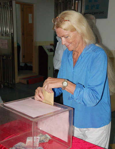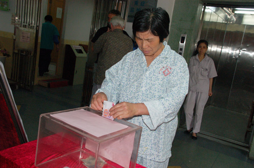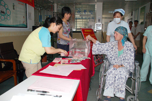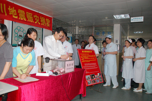 我院于2008年5月16日早上8:30举行赈灾捐款活动,在“爱的奉献”歌声中,在徐院长的号召下,各科医生、护士和后勤人员纷纷解囊,捐献自己的一份爱心,全院所有人都参加捐款活动。更令人感动的是许多病人得知正在组织为四川灾区之事后,也积极捐款,有的病人是在家人的搀扶下来捐款,有的却是坐着轮椅在家属的陪护下来捐款,场面感人。