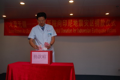 随着会场响起“爱的奉献”歌声,复大医院员工向印尼灾区捐款仪式正式开始--徐院长、左院长、牛院长带头捐款,随后员工们鱼贯而行,纷纷上台捐献自己的一份爱心!