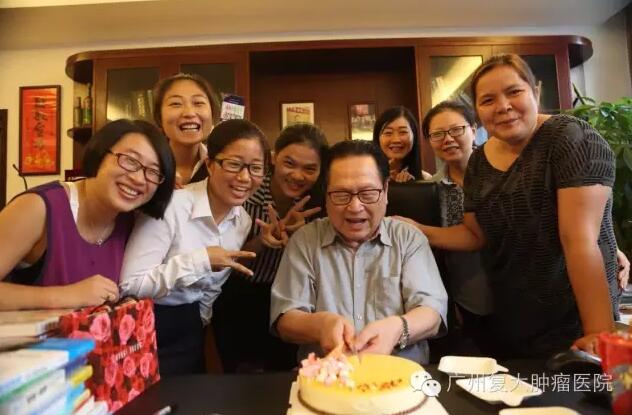 在复大肿瘤医院获得新生的彭细妹(右一),与复大员工一起为徐院长庆祝生日