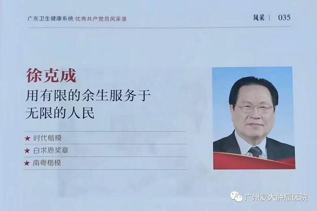 作为时代楷模、白求恩奖章获得者、南粤楷模,广州复大肿瘤医院徐克成荣誉总院长的先进事迹——《徐克成:用有限的余生服务于无限的人民》也被收录其中。在此之前,徐克成作为百名优秀党员的一员,其事迹也被广东卫生在线公众号启动的典型宣传活动——“庆建党百年华诞 学优秀共产党员”报道。(点击查看原文>>)