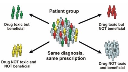 目前所指的个体化治疗是指分子水平上的。通过对基因/蛋白质表达的分析,可预测同一种癌症治疗后,在不同的人产生以下4种结果:①药物产生毒性,但有疗效;②产生毒性,无疗效;③没有毒性也无疗效;④无毒性,有疗效(图10)。
