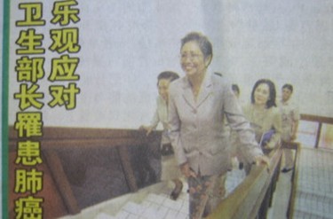 我们一直对部长的病严加保密,因为高级官员的健康是国家机密,这似乎是全世界的惯例。部长后来两次来院都是周五来,星期天回国。今年一月底,我在美国访问,突然接到印尼朋友电话,告诉我部长生病的消息在印尼被媒体公开了,报纸电视上均是部长生病的消息。第三天,印尼朋友告诉我部长已召开记者招待会,介绍在广州治疗的情况,她说:“我已康复。如果你们愿意,会议结束后我们一起去游泳,看谁游得快。”同时传来刊登在印尼国际日报上的部长上班的照片,上写道“卫生部长罹患肺癌乐观应对”。(图13)