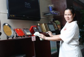 是呀,彭细妹现在我院当义工。每当我看到细妹红红的面孔和面孔上总是挂着笑容时,心里说不出来的高兴。回想起2009年12月19日下午3点,广东湛江市中心人民医院广场上,彭细妹在几个人的搀扶下来到我面前。那时的她面孔焦黄,瘦枯的双手捧着大肚子,连衣裙半掩着高度浮肿的双腿,双脚踏着没有后跟的鞋子。3天后,我院派车将她接来我院时,呼吸急促,频临死亡。接下来,抢救,手术,切除肿瘤和囊液55公斤,术后康复,2011年春节,彭细妹变成一个靓丽的“新人”,回到茂名的家,回到几年未见的父母身边(图16)。