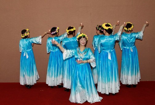 2012年1月13日,于我院北区会堂举行的迎春晚会上,广州“生命之光”俱乐部癌友患者的舞蹈《一个也不能拉下》正在演出(图23),舞姿,歌声感人——生命就像一棵草,在蜿蜒曲折中长高;