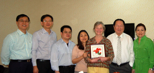 上图:郭琳女士2013年11月来复大肿瘤医院复诊治疗时与她的医疗团队合影。左起王苏星医学博士,牛立志院长,文卫峰主任,孔小峰主治医生,郭琳女士,徐克成教授,刘丽宝副院长。