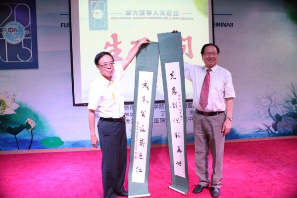 钟子美为复大肿瘤医院题写对联,与徐克成教授合影