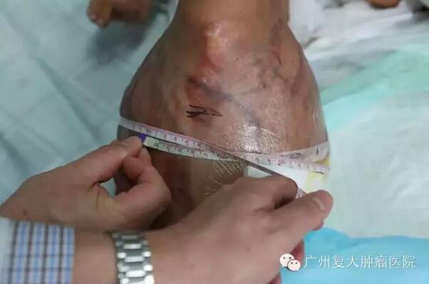 3月28日,副院长穆锋博士把我领到三区319房看望艾琳。当时的她头上无一丝头发(化疗引起),面色晃白,肋间隙深陷,腹部状如小舟。右腿瘦如枯枝,周径5.5厘米,而用纱布裹着的左小腿粗如水桶,包裹的纱布下,从小腿后面长出一椭圆形瘤子,周径61.5厘米,用双手丈量不能合拢,表面皮肤紫暗,部分皮肤溃烂。再看CT片,图像显示小腿部有一巨大瘤块。马来西亚的医院做活检显示恶性梭形细胞瘤。我建议复查CT和MR,了解血管情况,同时积极改善全身营养状态。