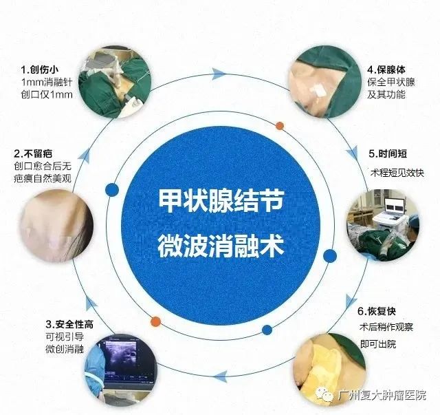 甲状腺结节微波消融术具有无需开刀、创口仅针尖大小、出血少、术后不留疤痕,手术时间短、恢复快等优势,可以保持颈部美观,能较大限度地保留甲状腺功能,且在高清彩超引导下手术可视进行,能够精准发现微小病灶,术后即可恢复活动,绝大部分患者稍作观察便可出院,不影响工作和生活。