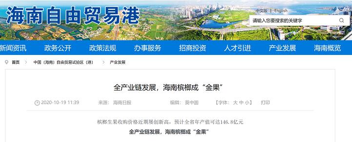 2020年10月,海南省政府官网刊登的文章显示,海南槟榔成“金果”!槟榔是海南极具地方特色和优势的重要热带经济作物,是省政府大力倡导发展的“三棵树”之一,预计全省年产值可达146.8亿元。