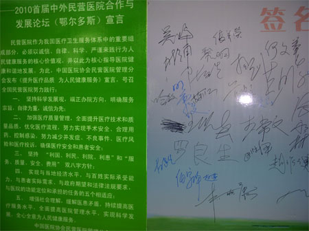 2010年7月17日-21日,由中国医院协会民营医院管理分会、卫生部医院研究所、法国民营医疗协会主办,市卫生局、东胜区人民政府、市民营医疗机构协会主办的“2010首届中外民营医院合作与发展论坛”在鄂尔多斯市举办,法国卫生部和民营医协会代表团、日本民营医院代表、国家卫生部和中国医院协会的相关负责人、自治区卫生厅级领导及500多家国内外民营医疗机构及行业相关人士参加论坛。我院左建生总经理代表医院作为第三批“全国诚信民营医院”应大会特邀参会并发言。