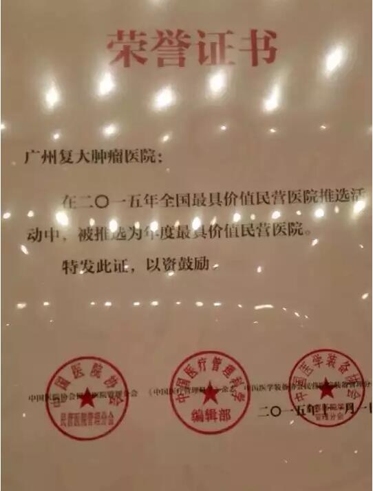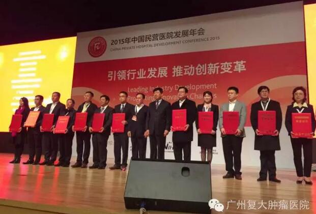 2015年11月1日,2015年中国民营医院发展年会在西安召开,会上发布了2015全国最具价值民营医院榜单,来自全国各地共有38家医院脱颖而出,广州复大肿瘤医院是其中一家。榜单如下(排名不分先后):