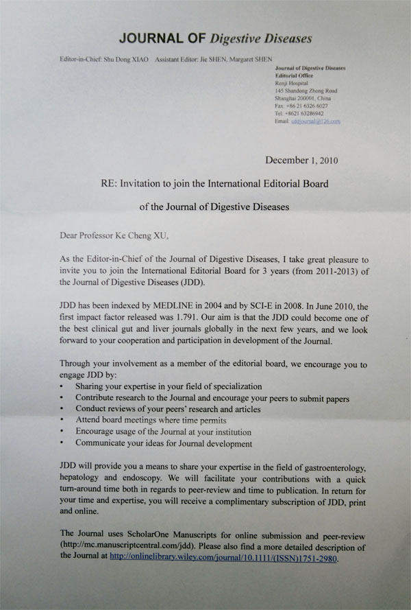 2010年12月1日,我院徐克成总院长受聘为消化病杂志(Journal of Digestive Diseases, JDD)的国际编委,任期3年(2011-2013)。