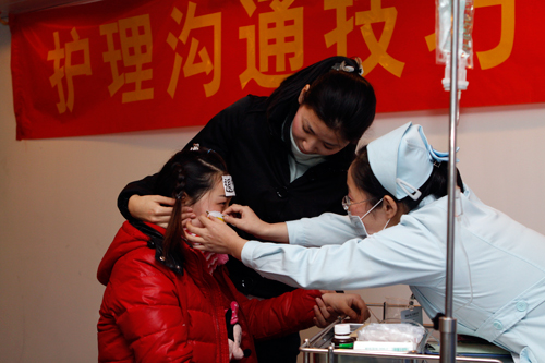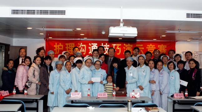 2011年1月21日下午,医院九楼会议室里传来阵阵掌声,很多护士聚集在这里,连平时忙碌的院领导们都聚集在这里。一时间照相机、摄影机都对着舞台拍个不停。间或还能听到轻快的笑声、低低的抽泣声。这里正在举行护理人员沟通技巧竞赛。站在舞台上的都是平时工作在一线的医护人员。
