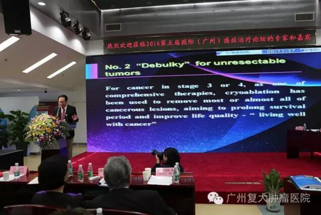 2016年7月2日,在2016第五届国际(广州)癌症治疗论坛上,20多位中外肿瘤治疗领域的专家就肿瘤治疗的新思路、冷冻治疗、不可逆性电穿孔(纳米刀)治疗肿瘤、干细胞在肿瘤领域中的应用等议题进行了深入探讨和交流。他们探讨的专题包括——