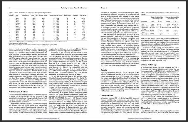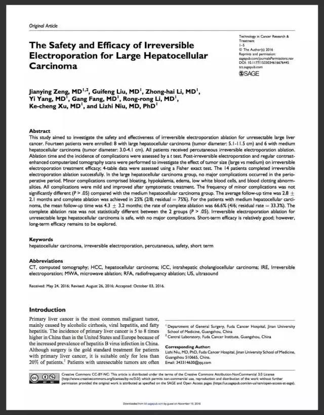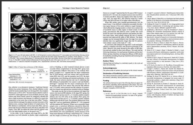 广州复大肿瘤医院纳米刀临床研究小组近日在美国权威学术期刊 Technology in Cancer Research &Treatment 上发表一篇题为 “The Safety and Efficacy of Irreversible Electroporation for Large Hepatocellular Carcinoma” 的学术论文[中文译为“不可逆电穿孔消融(俗称“纳米刀消融”)治疗大肝癌的安全及疗效”],报告了该小组在纳米刀消融治疗大肝癌的研究成果。