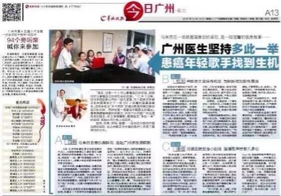 《羊城晚报》A13版头条登出《马来西亚女歌手罹癌,广州医生“多此一举”觅生机》