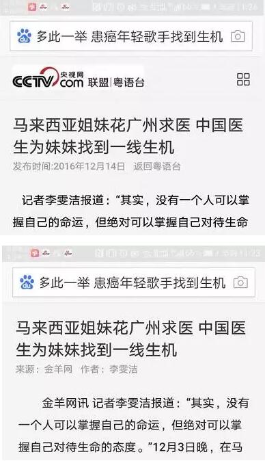 继12月11日中新社播发通讯《马来西亚音乐姊妹花在广州医院演奏中马情谊》后,2016年12月14日《羊城晚报》A13版头条登出《马来西亚女歌手罹癌,广州医生“多此一举”觅生机》,马来西亚蒲公英合唱团一场慈善演奏会的背后,是一段温馨的医患故事……这则感人的医患故事打动了读者,打动了编辑们,先后有手机APP“羊城派”、央视网粤语台、金羊网、南方网、网易、新浪网、搜狐网等众多主流新媒体网站转发,形成又一轮传播,影响广泛。