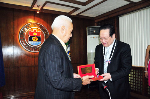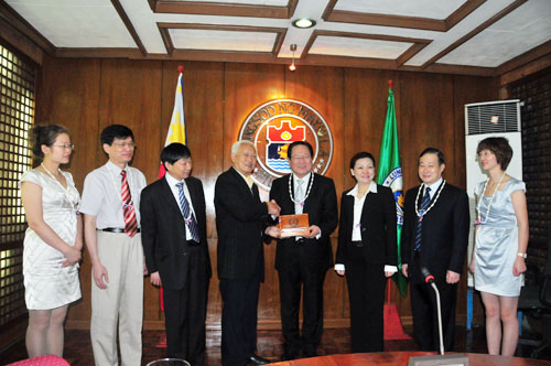 2011年5月29日上午10时,菲律宾马尼拉市政厅门前,鼓声齐鸣,由上百名身穿白色军装的乐手组成的乐队正在演奏菲律宾国歌和中国国歌。在菲华联谊会理事长、副理事长等领导成员陪同下,广州复大肿瘤医院总院长徐克成和总经理左建生等一行7人,由市长助理Gemma Cruz-Araneta 小姐引导,来到市长接待室。10时15分,市长阿尔弗雷多. 林先生来到接待室,与坐在主宾席的徐院长和左总经理热情握手。市长发表欢迎辞。他说:“广州复大肿瘤医院是国际知名肿瘤专科医院,成功治疗了许多菲律宾病人,有着良好的声誉和广泛的影响。今天我们接待徐院长一行,希望借此机会,增强两国人民的友谊,加强两国医学技术合作,促进医疗事业不断发展……”。徐院长作了答词,感谢市长的接见,表示要进一步提高医疗技术,改善服务,让每一个菲律宾病人满意。他说:“我们医院坚持~真诚和真实~的原则,坚持开放的方针,欢迎菲律宾的医疗同行访问复大,交流技术,切磋服务。”