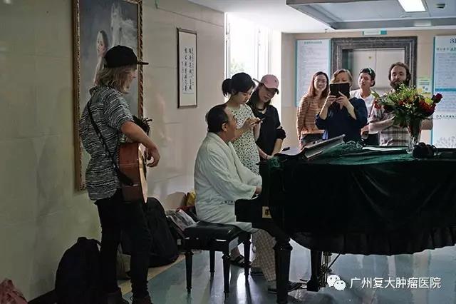 两位志愿者搀扶身穿白长袍的G先生缓缓来到钢琴边,G先生是一位来自印尼的患者,今年70岁,弹钢琴是他的爱好。在妻子和女儿的陪伴下,他弹了一曲《奇异恩典》,边弹边唱,国际志愿者乐队伴奏。悠扬的音乐响起,在场的人随着音乐轻声哼唱。
