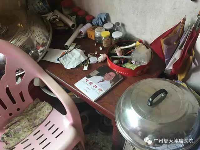↑ 探望结束后,穆峰副院长与一众工作人员又来到黄凤香老人的家中。今年已73岁的她,与丈夫挤在一间不足20平的房间里。一眼望去,屋内没有一件像样的家具,一张棕色矮木桌上堆满了药瓶和杂物,还放了一本徐克成教授所著的《与癌共存》。