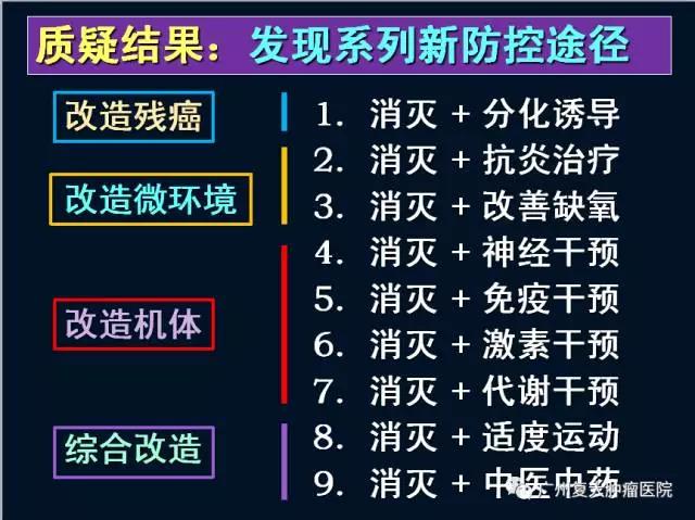 汤院士说:“我们目前进行的'消灭肿瘤疗法促残癌转移及其干预'研究,同样源于质疑,质疑'斩尽杀绝'战略。质疑不是否定一切,而是一分为二地看问题,既肯定'消灭'的作用,又要找到弥补杀癌负面问题的办法。