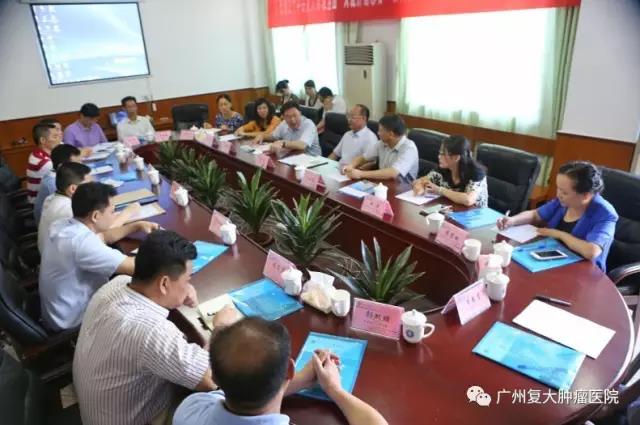 广东省扶贫办梁健主任、广东省扶贫办扶贫开发处黄碧云副处长、广东省扶贫办扶贫开发处邓敏科长,揭阳市政协副主席、揭西县委陈群峰书记、揭西县黄书香副县长、揭西县人社局彭双蛟局长、揭西县民政局贝平波局长以及揭西县卫计局李文涛局长等一众领导及工作人员参与了本次座谈会。广州复大医疗股份有限公司总裁左建生也出席了本次座谈会。各方就如何进一步开展组织建档立卡的贫困肿瘤患者的摸底、筛查与核实工作,如何做好贫困肿瘤患者的义诊、健康宣教、双向转诊等问题展开座谈讨论。