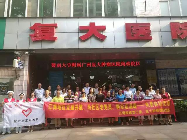 2017年9月12日上午,由暨南大学附属广州复大肿瘤医院、广州市天河区徐克成关爱健康工作室与江海街道党工委联合举办的“江海地区党建共建 为社区老党员、群众送温暖”免费体检活动吸引了50位街道辖内老党员、老群众前来参加,让老党员、老群众感受到“老有所'医',老有所养”、“医养结合”新模式下的高品质服务。该活动得到广州民政局、广州市社会组织联合会支持。