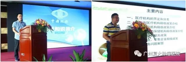 第二阶段学术报告会由常务副主任委员、中山大学附属第三医院陶玲副主任主持。海珠区国税税政科钟创章科长(如下左图)就医药行业税收政策、生物制品简易征收办法、税收减免(优惠)管理等方面为与会委员作了解读。广州地税大企业局王坚老师(如下右图)则分享了医疗机构零售药房税收政策、个人所得税、医药制造和经营企业税收政策,并解答了相关税务问题。