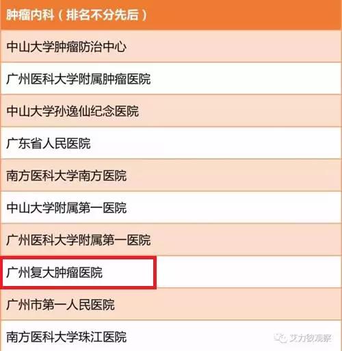 其中内科、肿瘤科系列共评出心血管内科、呼吸内科、消化内科、神经内科、肿瘤内科、肿瘤放疗科等12个专科榜单,共计110个上榜科室,来自25家医院。在肿瘤内科榜单中,中山大学肿瘤防治中心、中山大学孙逸仙纪念医院、中山大学附属第一医院以及广东省人民医院均上榜,其中,暨南大学附属广州复大肿瘤医院排名第八位,仅次于广州医科大学附属第一医院,是该榜单中唯一一家上榜的民营医院。
