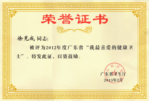 广东省卫生厅在全省开展了“我最喜爱的健康卫士”和“群众满意的医疗卫生机构”评选宣传活动,从2013年2月19日至2月25日,为评选活动公示期。经过各地各单位民主推荐、网络投票、综合评审等环节,广东省卫生厅授予徐克成等10名同志2012年广东省“我最喜爱的健康卫士”荣誉称号,授予粤北人民医院等10家机构2012年广东省“群众满意的医疗卫生机构”荣誉称号。