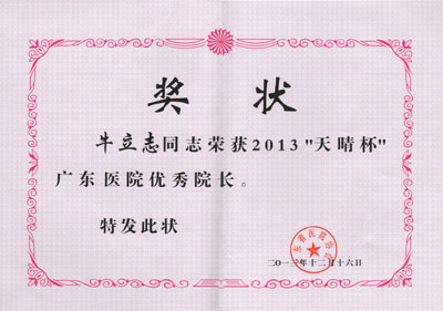 广州复大肿瘤医院牛立志院长于2014年1月11日受广东省医院协会邀请,参加2013年“天晴杯”广东医院优秀院长优秀管理干部颁奖典礼,大会共评出15位广东省优秀院长,牛立志院长是此次大会唯一一位受表彰的民营医院院长,堪称先例!