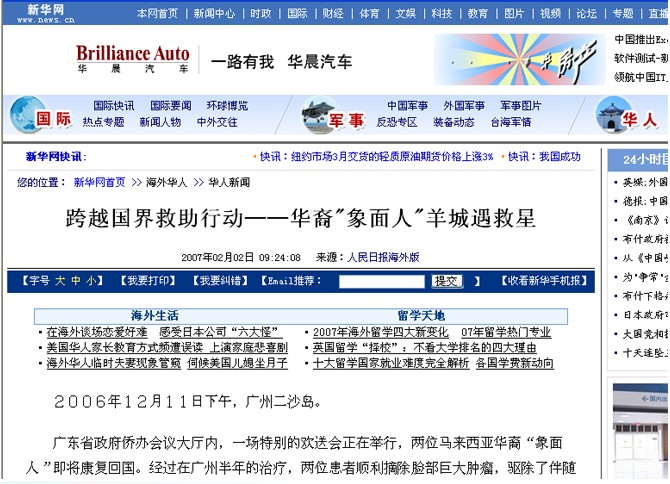 广州复大肿瘤医院救治“象面人”的事迹,深深感动着海外华侨华人。马来西亚主流媒体全方位报道了救治“象面人”全过程。