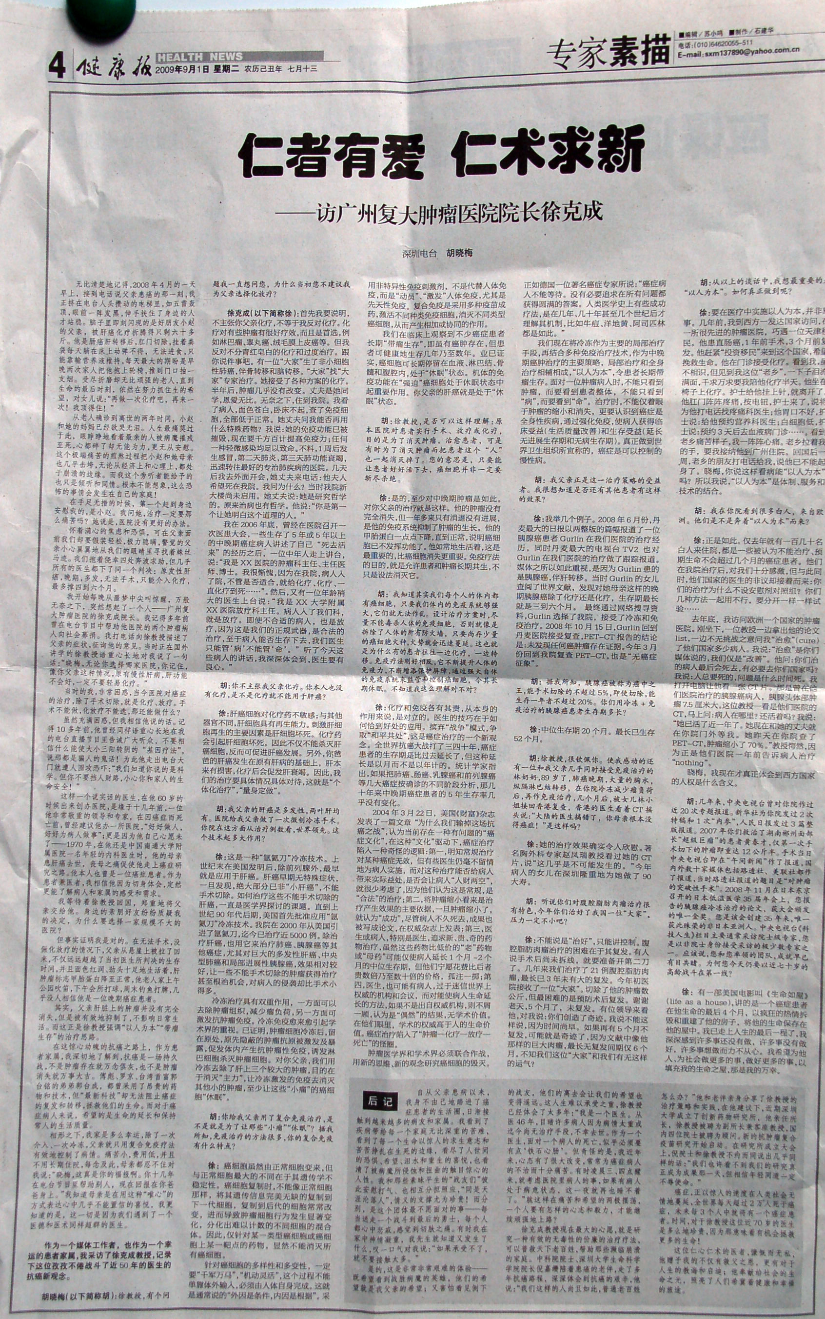2009年9月2日《健康报》第4版整版报道了著名电台主持人胡晓梅在抗癌救父路上心得和感言,现转载如下: