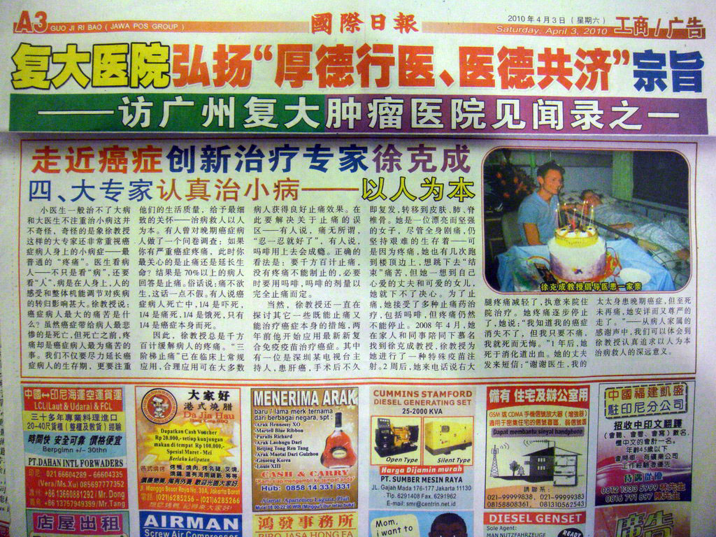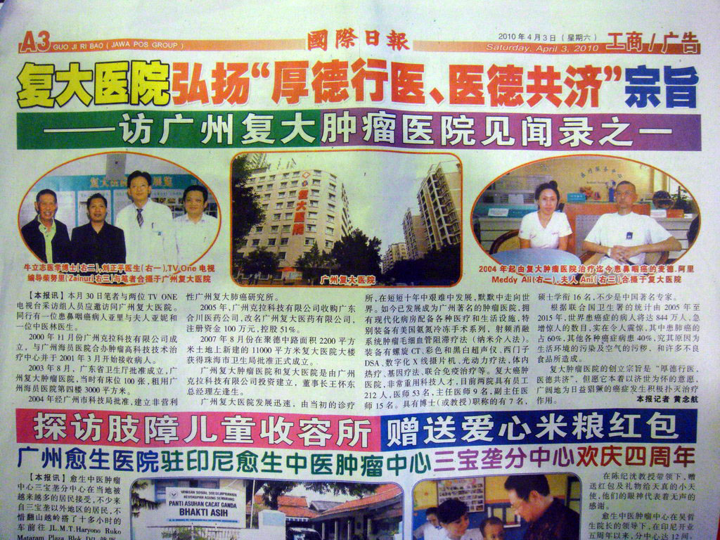 印尼《国际日报》2010.4.3刊登了标题为“复大医院宏扬~厚德行医、医德共济~宗旨”的文章,记录了记者来访广州复大肿瘤医院见闻。