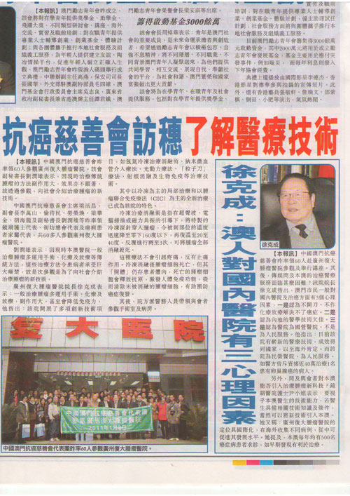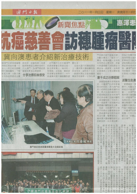 《澳门日报》等澳门本土媒体 2010年1月3日 登载了中国澳门抗癌慈善会参观团访问我院的新闻报道。