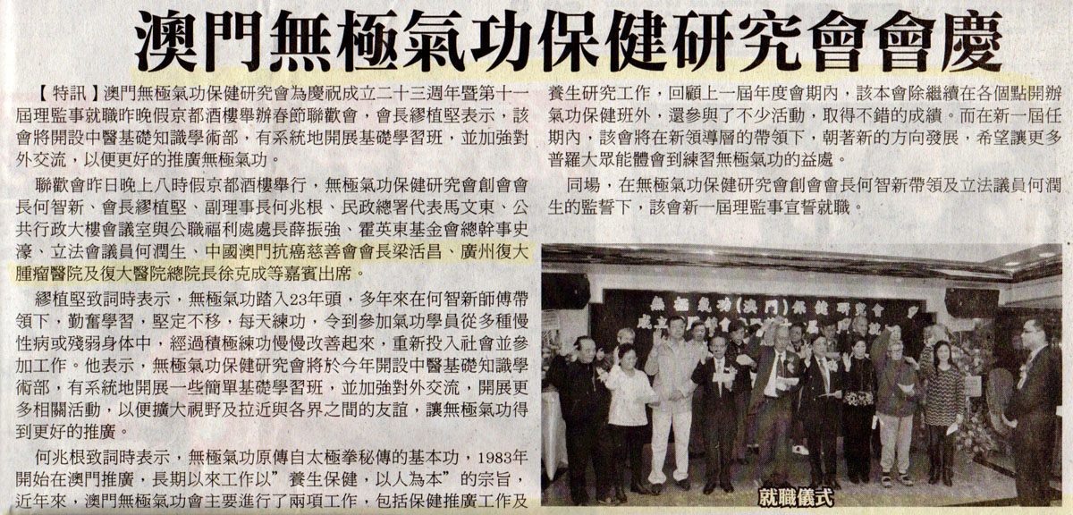 澳门《濠江日报》2011年3月6日报道徐院长参加澳门癌肿新方法报告会,向市民介绍治疗肿瘤的新技术,此外,还报道了徐院长参加无极气功保健研究会会庆的消息。