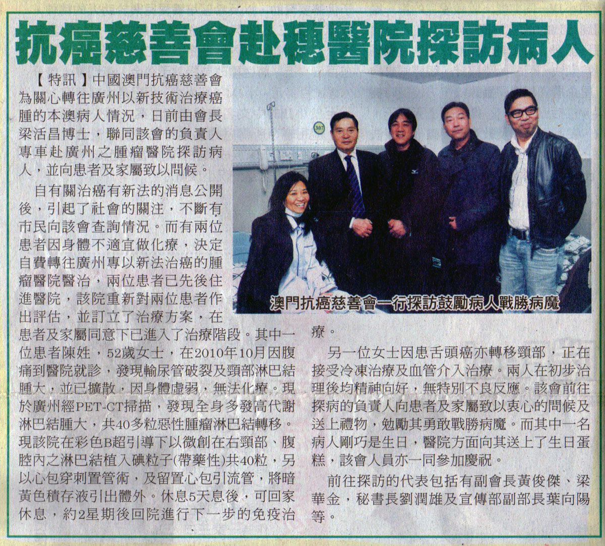 澳门《大众报》2011年3月10日报道中国澳门抗癌慈善会到我院探望澳门患者的消息。自有关治癌有新方法的消息在澳门公开后,引起了社会的关注,不断有市民向该会查询情况。而有两位患者因此转至我院治疗,目前这两位患者治疗效果良好。
