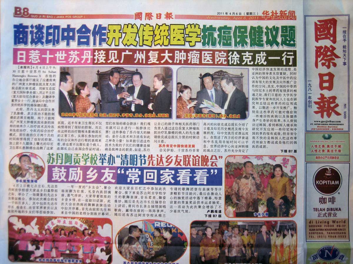 2011年4月4日上午9:30 日惹十世苏丹SRI SULTAN HAMENGKU BUWONO X 在他的办公地会客厅接见了应邀前来的广州复大肿瘤医院及复大医院总院长徐克成教授、刘丽宝总监(复大国际事务部)、刘正平主任等一行,商谈印中合作开发传统医学抗癌保健议题。