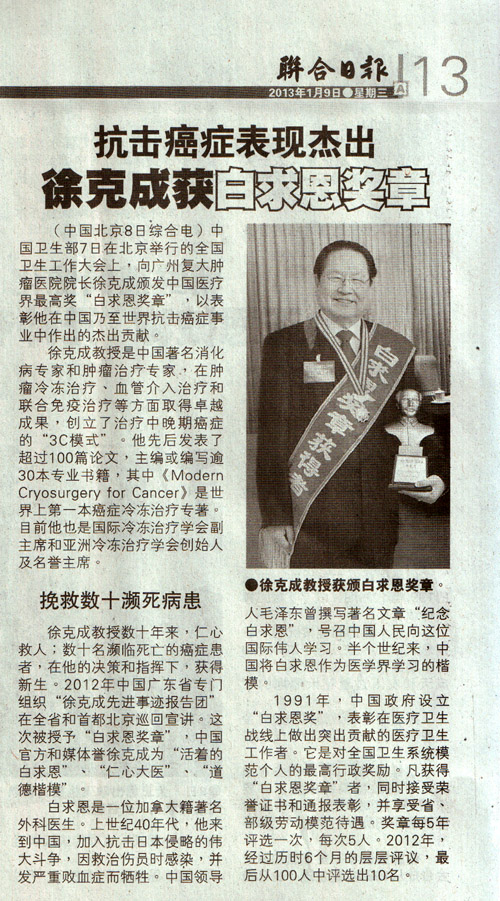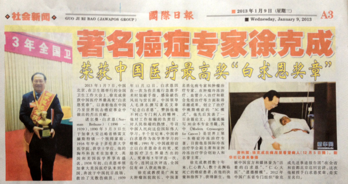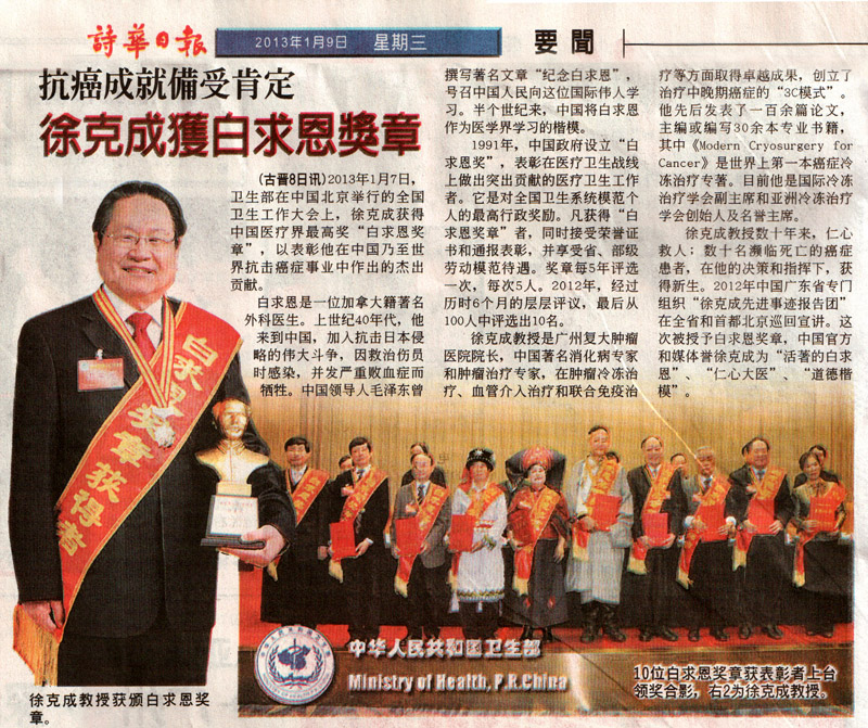 徐克成教授数十年来,仁心救人,数十名濒临死亡的癌症患者,在他的决策和指挥下,获得新生。他被中国官方和媒体誉为“活着的白求恩”、“仁心大医”、“道德楷模”。2012年中国广东省专门组织“徐克成先进事迹报告团”在全省和首都北京巡回宣讲。这次他被授予白求恩奖章,是实至名归。