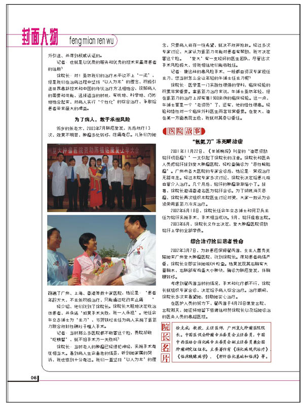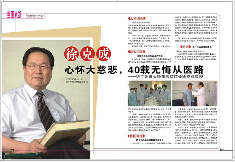 我院院长成为2005年6月出版的《健康之路》杂志的封面人物。《健康之路》杂志记者方敏抓住徐教授的空余时间,对徐教授进行采访,前后间断交流达数十次,最后以“徐克成:心怀大慈悲,40载无悔从医路——记广州复大肿瘤医院院长徐克成教授”为题报道了徐教授。