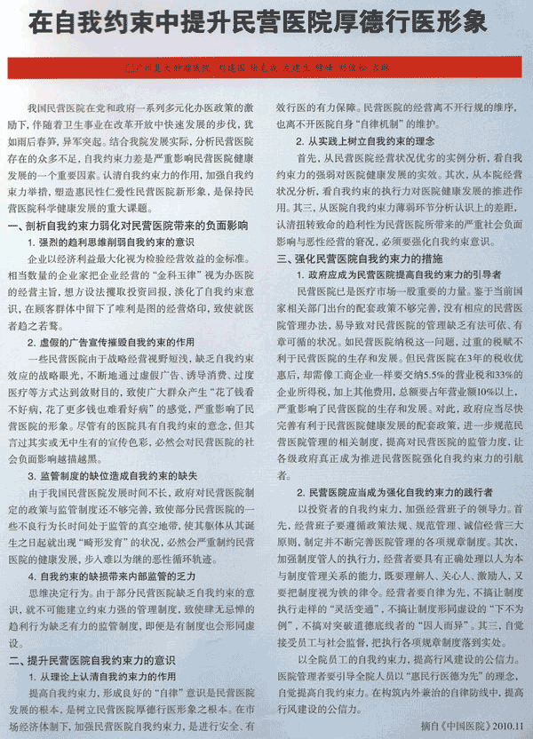 2011年6月,《人民文摘》专刊刊载“在自我约束中提升民营医院厚德行医形象”文章。