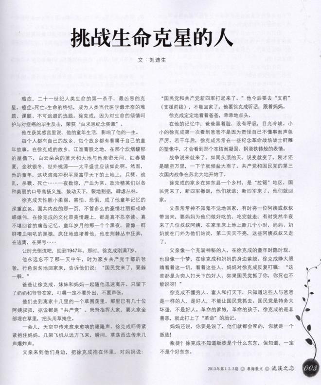 癌症,二十一世纪 人类生命的第一杀手,最凶恶的克星。癌症=死亡=生命的终结,成为人类当代医学最无奈的难题、课题、不可逃避的选题。徐克成,因为对生命的倾情呵护与对癌症的必胜反击,荣获“白求恩纪念奖章”。