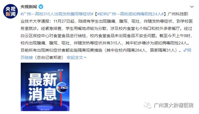 根据校方通报,截至11月30日12时,目前校内出现腹痛、腹泻、呕吐、伴随发热等症状共有315人,其中已确诊为诺如病毒阳性学生患者18人。