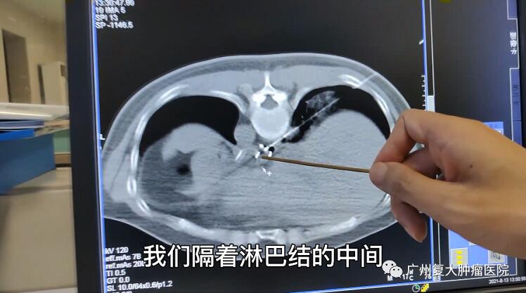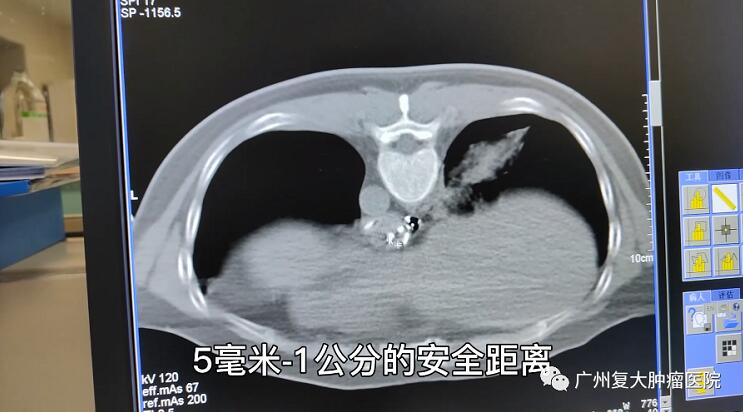 牛立志院长指出,患者的食管旁结节藏于主动脉脊柱、下腔静脉以及食道中间,只能从另外一个角度进行穿刺,进而将粒子植入结节内,从而防止结节再长大,压迫食道,造成梗阻。而在植入的过程中,要始终将粒子与主动脉、食管等组织保持一定距离,这样才能实现植入的粒子对肿瘤组织的近距离照射,杀伤肿瘤细胞的同时还能确保正常组织和敏感组织的安全性。