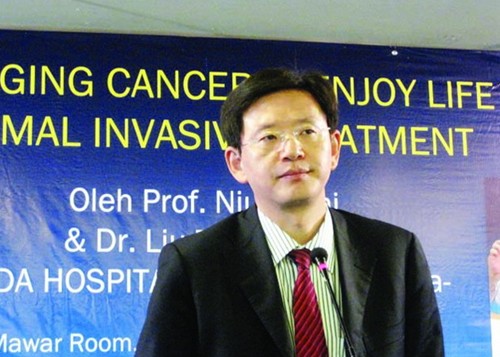会议邀请有新加坡和中国的多名肿瘤介入治疗专家到会。印尼全国的放射介入治疗及乳腺疾病专家和泗水地区各级医院院长到会约 300名。来自中国广州复大肿瘤医院的牛立志博士上午发言就头颈部肿瘤氩氦冷冻治疗做了精彩的演讲,并展示了不少治疗成功的图片,其中一位蒙古鲁患巨大甲状腺肿瘤的病人今天刚好发电子邮件给牛立志博士,寄来了病人今天的照片,已经恢复良好两年没有复发,感谢牛博士不开刀的冷冻治疗。据了解该患者的妻子是印尼普通科医生从医30余年,经验丰富,她看到当地同样一个巨大甲状腺肿瘤病人因手术几天内死去就决心要寻找新的方法给自己的丈夫治疗,2008年8月在雅加达见到刘正平医生了解到在复大肿瘤医院可以用氩氦刀分次冷冻治疗,随后到复大肿瘤医院分三次进行了冷冻治疗,之后逐渐缩小至正常状态,没有发生任何副作用。她衷心希望更多的人了解冷冻治疗新技术,听到说有些医生还不接受冷冻治疗不开刀治疗肿瘤的新方法,她非常高兴牛博士能亲自来做学术交流。她说如果有机会她愿意亲自作证,促进大家了解冷冻治疗,希望印尼的医疗技术发展更快。中国江苏省人民医院放射介入科主任医师李鳞荪教授也应邀来做脑血管瘤新技术介入治疗经验交流。