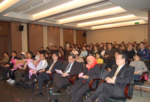 马来西亚驻广州总领馆Mr. Chai Ching Hau领事(左六)、Madam Roslina Long领事(左七)、香港《保健》杂志社长冯广泉(左四)、广东省电视台著名节目主持人侯玉婷(右四)、广州复大医院院长徐克成教授(左三)、副院长牛立志博士(右二)等与洪秀慧、陈嘉欣一起合影