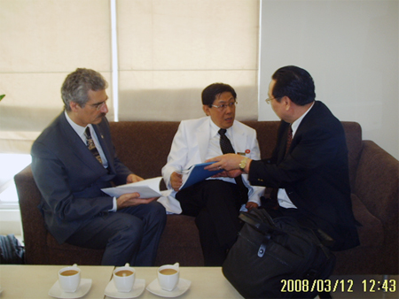 徐克成教授正与博士和郑子联院长讨论《肿瘤冷冻治疗学》在印尼和意大利出版