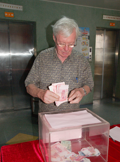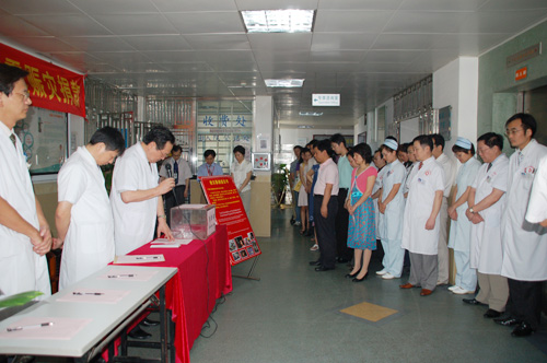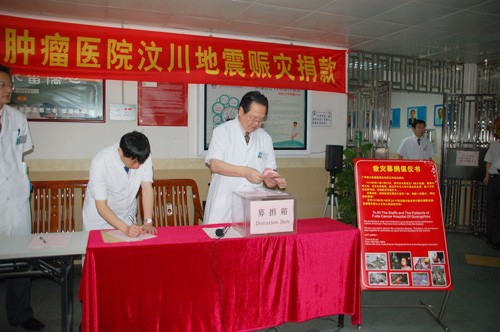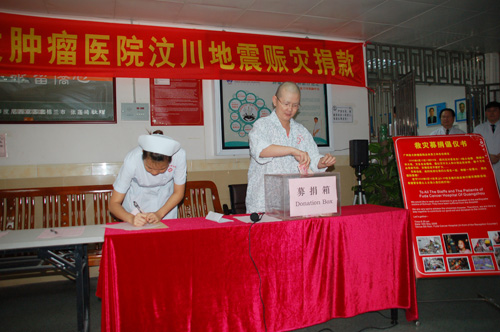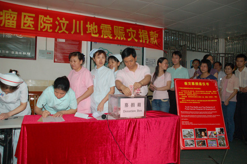 我院于2008年5月16日早上8:30举行赈灾捐款活动,在“爱的奉献”歌声中,在徐院长的号召下,各科医生、护士和后勤人员纷纷解囊,捐献自己的一份爱心,全院所有人都参加捐款活动。更令人感动的是许多病人得知正在组织为四川灾区之事后,也积极捐款,有的病人是在家人的搀扶下来捐款,有的却是坐着轮椅在家属的陪护下来捐款,场面感人。